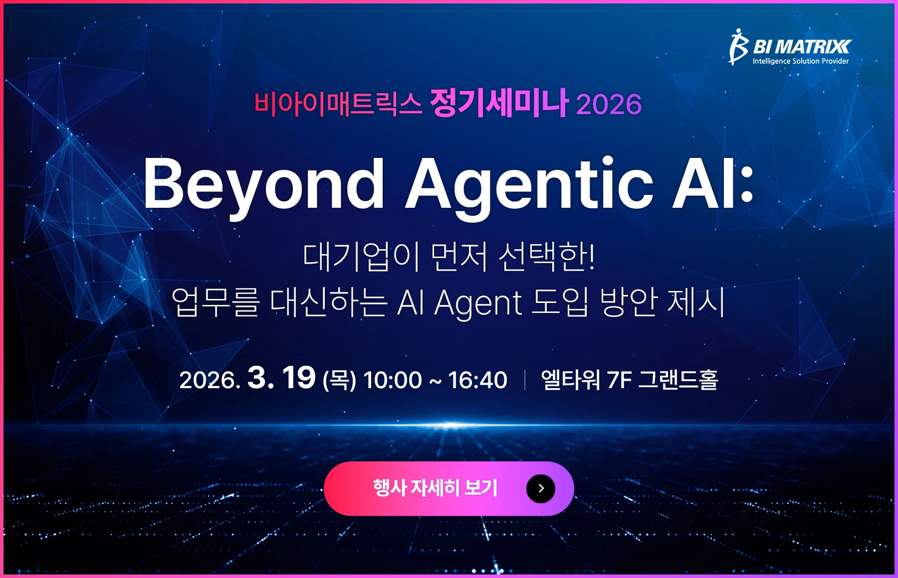 비아이매트릭스 정기세미나 2026에서는 Agentic AI 시대, 기업이 무엇을 준비해야 하고 어떻게 대응해야 하는지를 개념이 아닌 실제 구축과 운영의 관점에서 제시합니다.